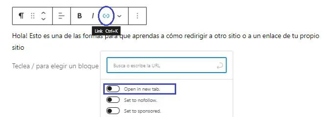Debes seleccionar la palabra o frase que deseas redirigir, seleccionar Ctrl + K o el símbolo marcado en el círculo azul, y agregar la URL