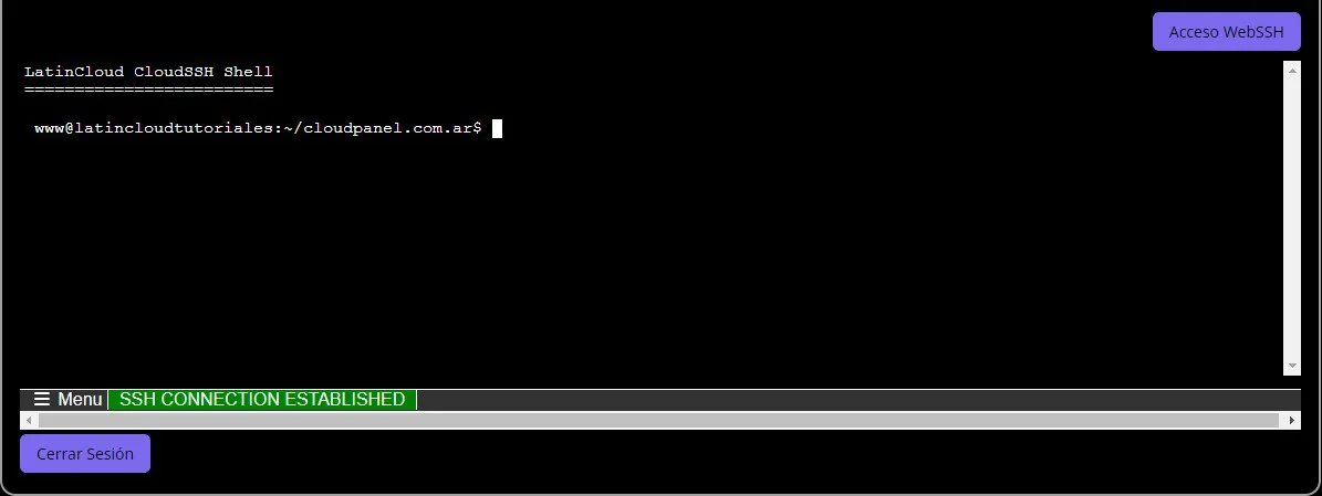 Una vez ahí, al clickear en “Acceso WebSSH”, se te abrirá una terminal en la cual podrás trabajar!